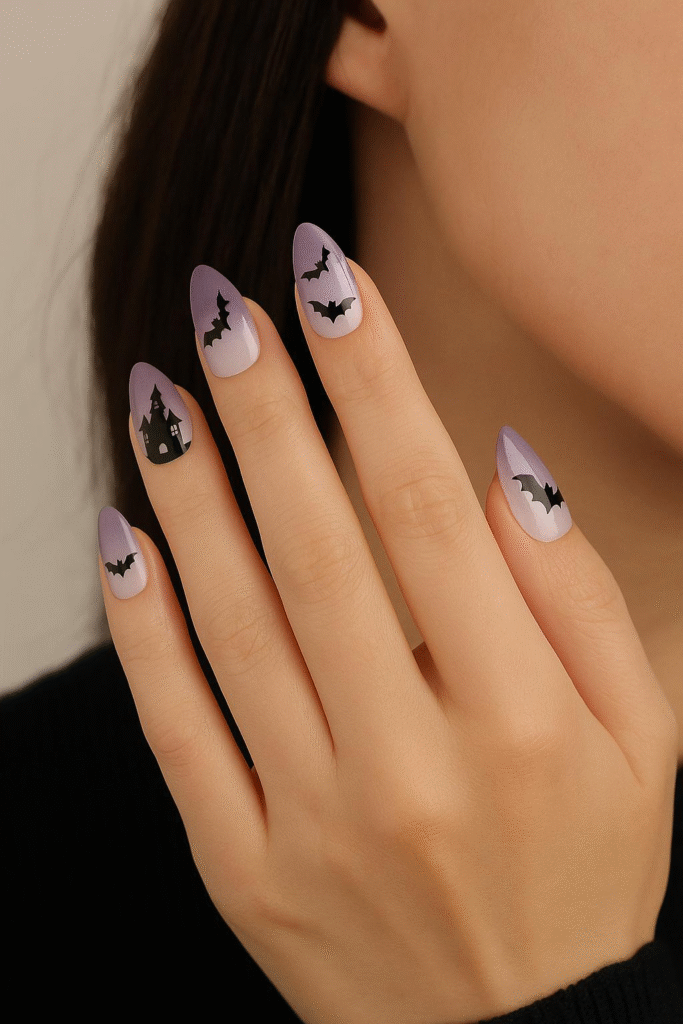 Want nails that feel straight out of a Tim Burton movie? These Halloween Press-On Nails with Bat & Horror Castle Design bring instant spooky drama. Picture creepy bats 🦇 fluttering across eerie purple gradients, with a haunted castle 🏰 that’s equal parts chic and chilling.